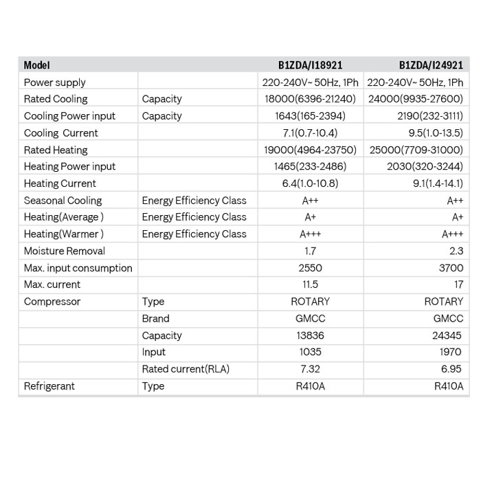 | Model number/Code | Capacity (Btu/h) | Energy Class |